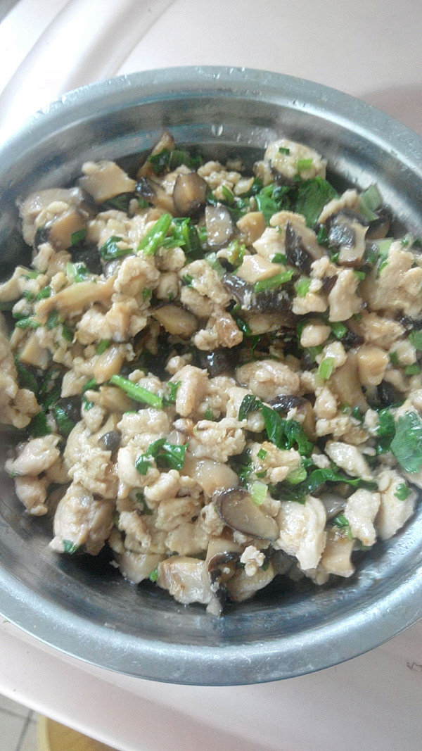 先将鸡肉和香菇切细粒,下锅炒熟,再加香菜炒两下,再装起来等下再用。