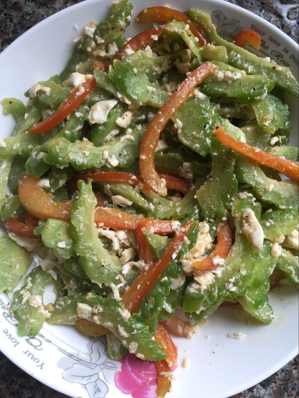 热锅入油放蛋黄炒起沙,加入蛋白碎,苦瓜,甜椒翻炒,关火,撒黑胡椒碎开吃。