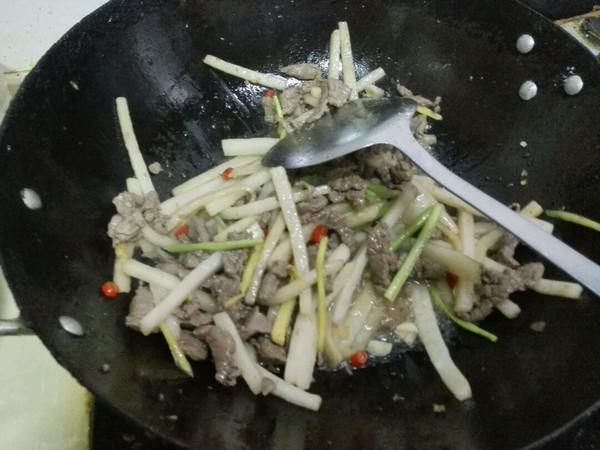 牛里脊肉洗净切粗丝(要横切,即逆着纹路切炒吃才会嫩),放容器里沥水一段时间。白萝卜去皮切粗丝,生姜切丝,蒜切片,小米椒剪成段。