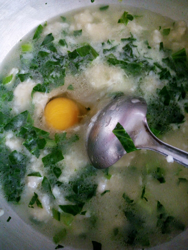 再打入一颗鸡蛋,停留几秒钟,快速用勺子划散。