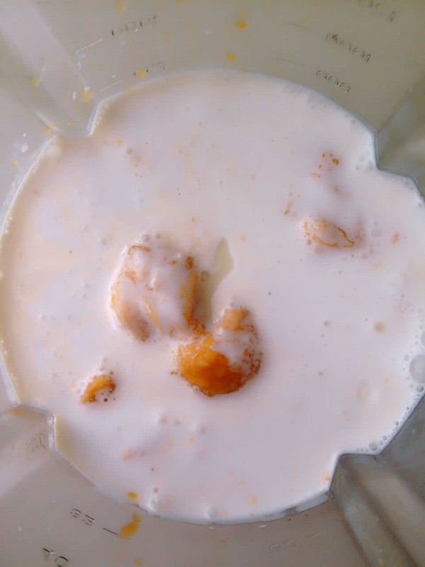 其余的芒果放入破壁机,同时倒入牛奶、淡奶、椰汁、炼奶一起搅拌10秒至绵滑。