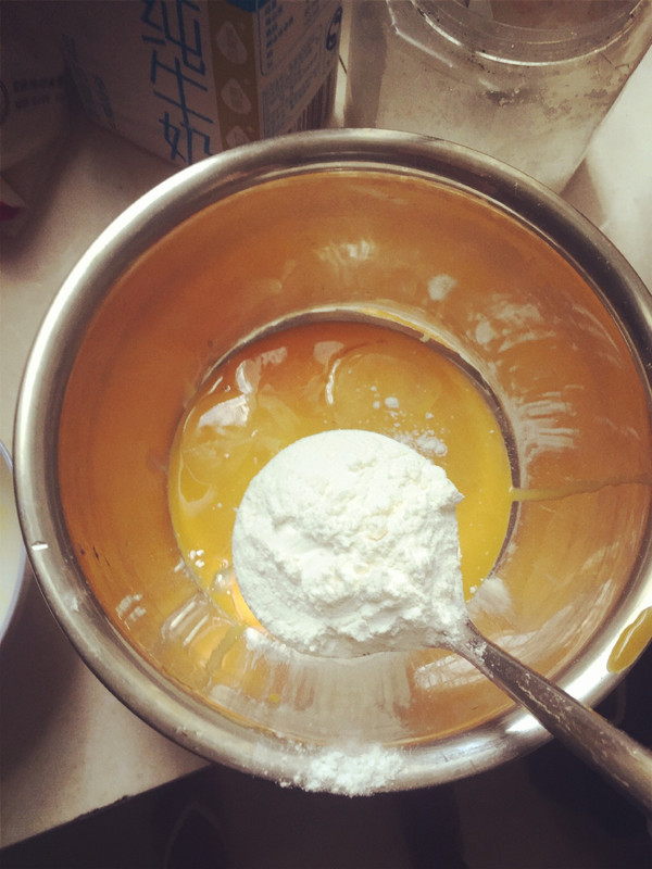 在蛋黄中加入6小勺面粉(如果是大的就加3勺)