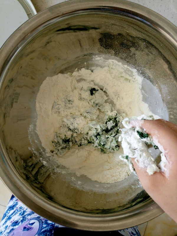 用煮的稀烂的叶子和面,可放少量的水,和的硬些