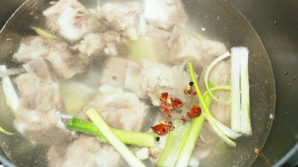 重新加一锅冷水(水要一次放足,中途不加水),放入排骨、葱段、姜片、花椒八角(这个是选用,也可以不放哦),中火炖30分钟以上。