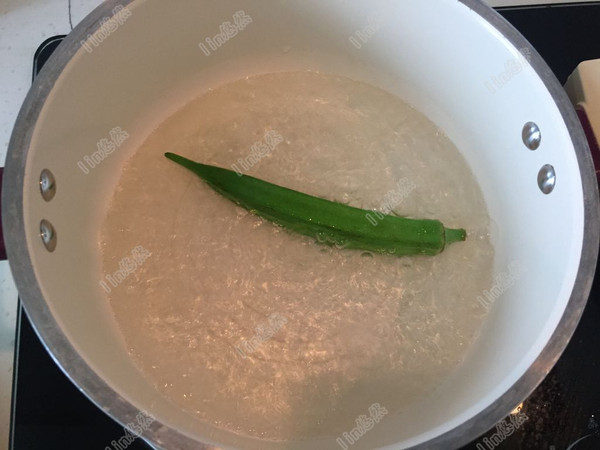 秋葵入开水中焯烫1分钟左右,捞出冲凉。