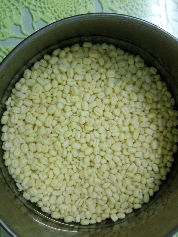 将去皮绿豆用冷水浸泡一夜。(也可以是有皮的绿豆,泡过后手工去皮,那样比较麻烦,所以我直接买的去皮绿豆。)