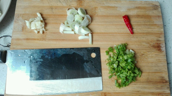 蒜切碎,大葱葱段切片,小米椒不用切,小葱切碎。