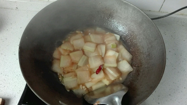 冬瓜片放入锅中翻炒。炒至七成熟然后放入耗油或酱油翻炒。