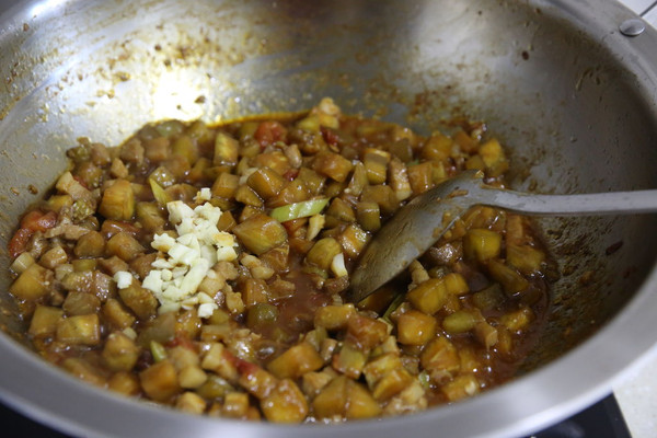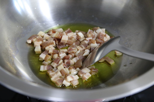 锅中放入橄榄油(多放一点,因为茄子比较吃油),油温6成热时下五花肉丁