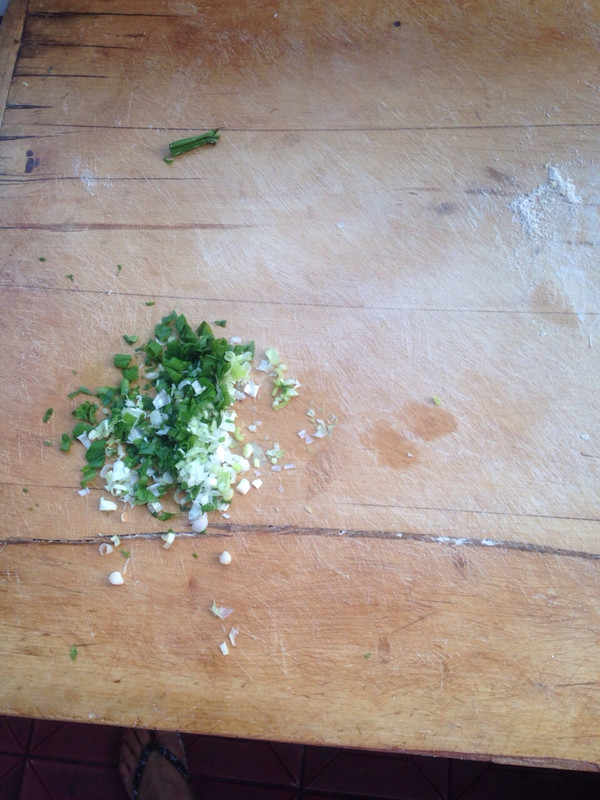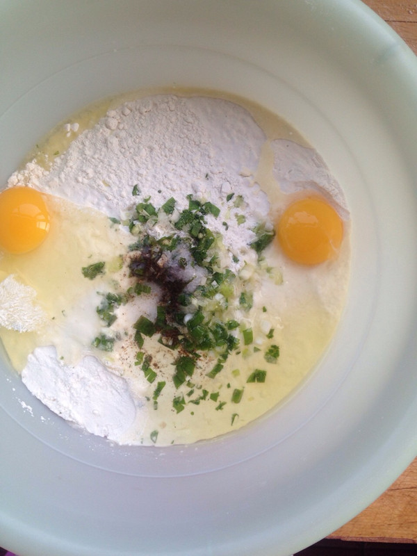 准备适量的面粉,适量的食盐和花椒粉,两个鸡蛋,切好的葱花,加水凉拌成糊状