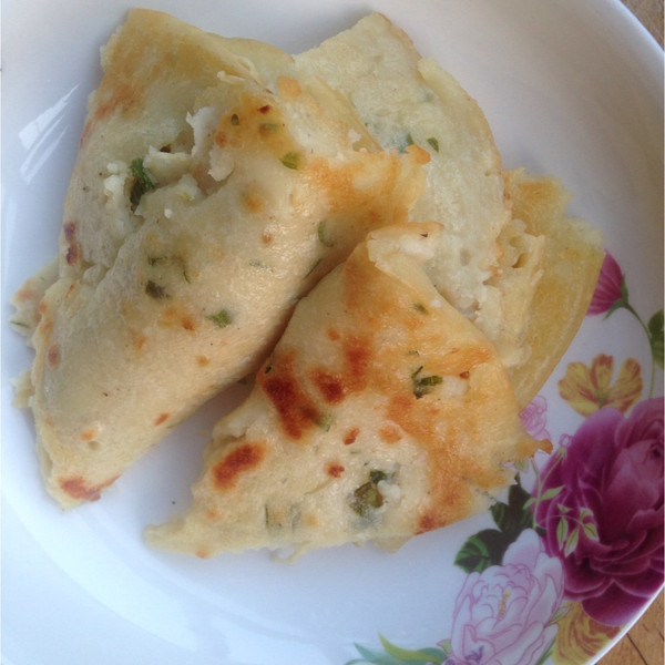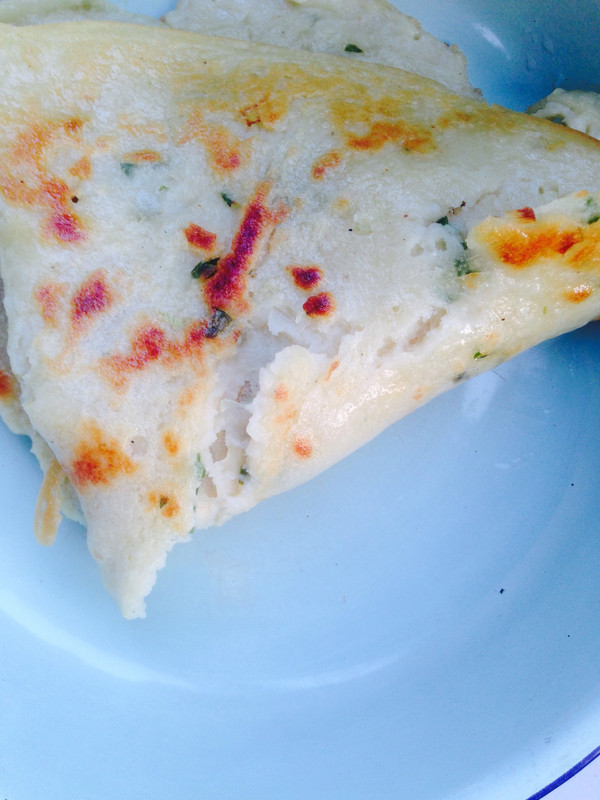 将打好的面糊糊,倒入擦好油的饼铛里,等待饼的熟