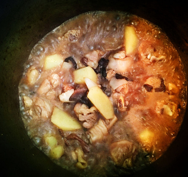 放土豆、蘑菇、豆腐皮,焖制5分钟,