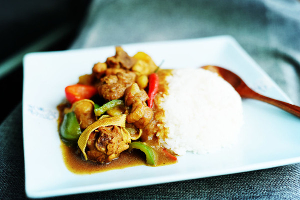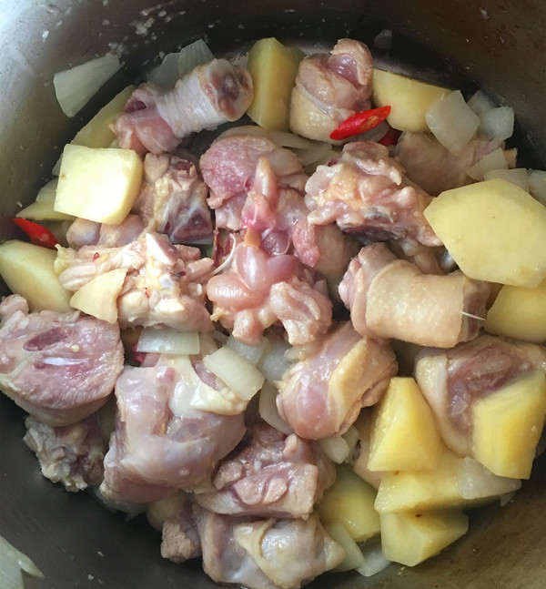 锅中加少量植物油,加热至180℃,加入蒜末、姜、葱、洋葱、辣椒,炒香;放鸡肉炒香;放酱卤汁炒焖制5~8分钟。