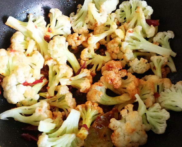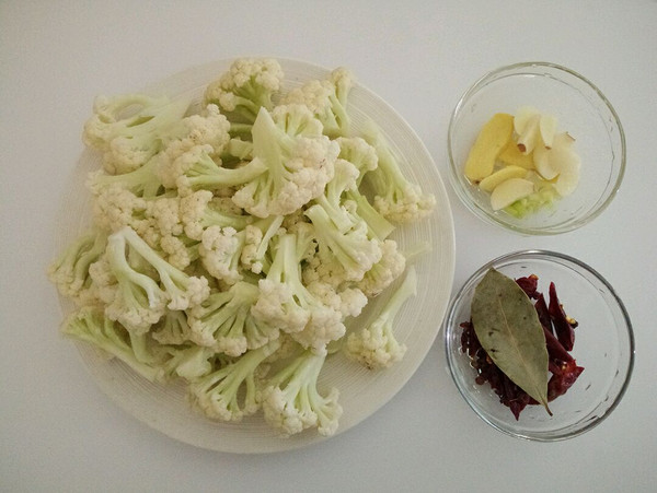 菜花切成小朵,洗净;葱洗净,切断;姜去皮洗净,切片;蒜去皮洗净,切片;干辣椒洗净,斜切两半;花椒、香叶洗净。