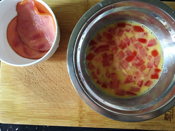 番茄切丁,倒入蛋液,(番茄里的汁液我都是不要的,会酸),热锅加少许油,倒入蛋液(番茄)用筷子把番茄铺平,避免叠在一起,煎好一面后,翻一面再稍微煎下就可以出锅了,火腿片2面稍微煎下就好
