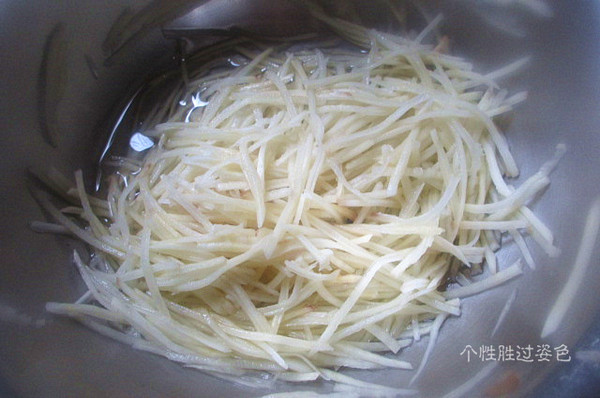 土豆去皮切成火柴杆粗细的丝,用水泡去多余淀粉