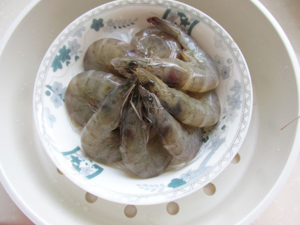把粉丝泡软,海虾剪去虾枪和虾毛,去除沙线,把大蒜和姜去皮。
