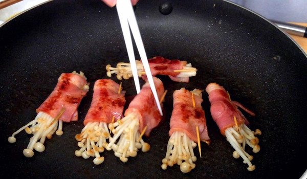 热锅冷油,锅热后放入两大勺油,将金针菇培根卷放入锅中煎,保持小火;
