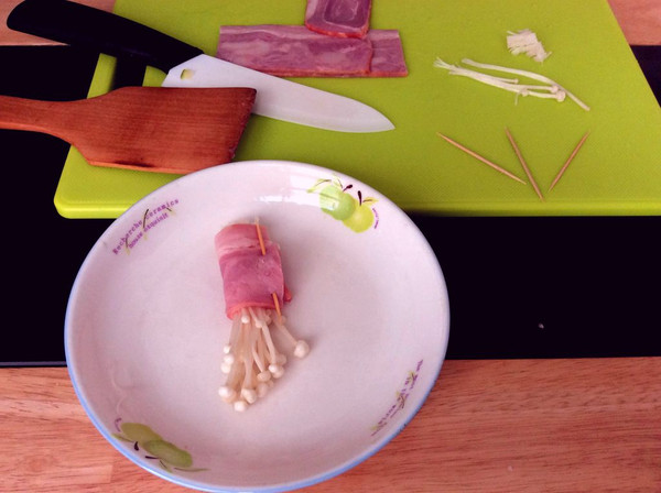 将培根视长短对半切。(我买的培根片比较长,切成三块比较合适)用牙签将金针菇培根卷固定;