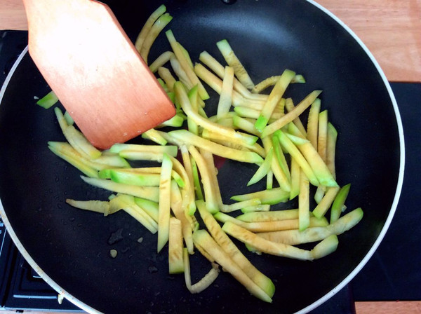 利用刚才煎培根的余油,热锅热油加入小南瓜,如果油太多可倒去一部分;