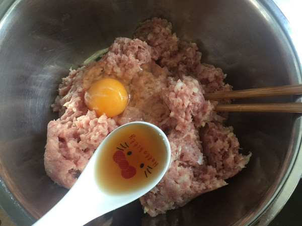 肉糜加入一勺酱油一勺料酒一个鸡蛋,搅打上劲