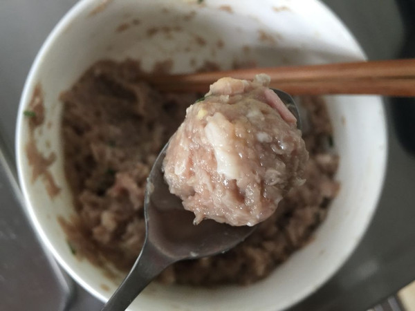 肉馅抓在左手中,从虎口处均匀挤出,就是一个小丸子