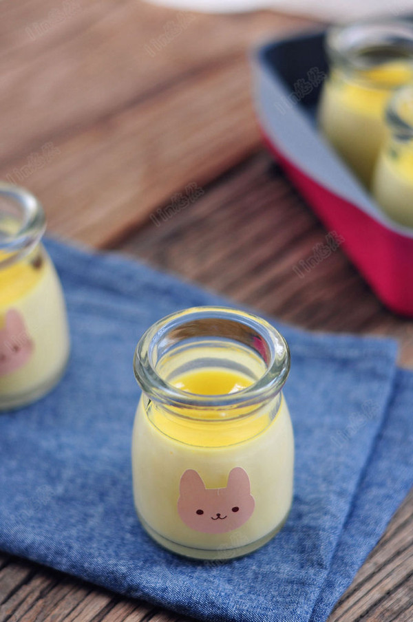 静置好的蛋液慢慢倒入布丁瓶中,将布丁瓶放入深烤盘,在烤盘中加入蛋液高度1/2高的热水。