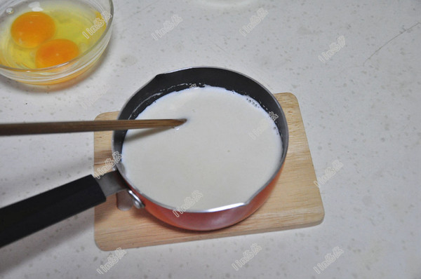 将晾凉的牛奶一点点加入打散的鸡蛋中,边加边搅拌。
