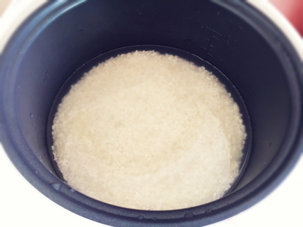 大米淘洗干净后,放入电饭煲中,加水煮饭,水量比平时少一点。