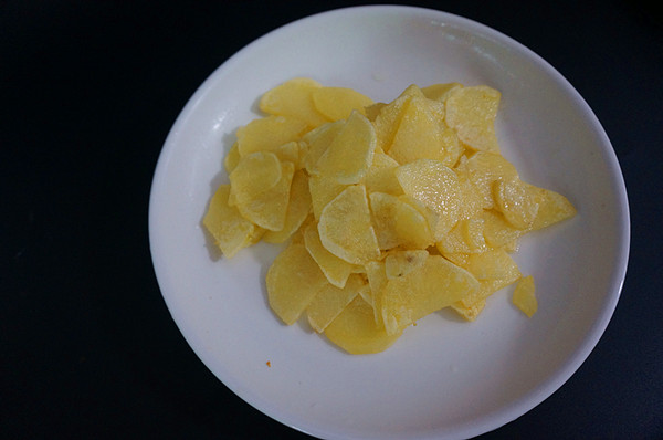 土豆去皮切成均匀大小的稍微厚一点点的片,然后洗净淀粉泡在水里,这样不容易变黑