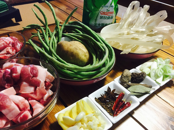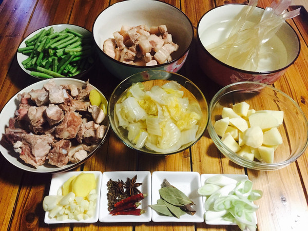 整理材料 一锅凉水,放入五花肉和排骨,加料酒和三片姜,煮沸,把肉捞出,用热水洗干净,控干水份,备用。豆角去掉两头,洗干净,切4cm段。土豆去皮切滚刀块。酸菜是整颗的,切成块,叶子切的面积大一些,根部小一下,为了避免过于酸,用凉水浸泡。宽粉用温水泡30分钟,泡软备用。干香菇用小碗水泡软。