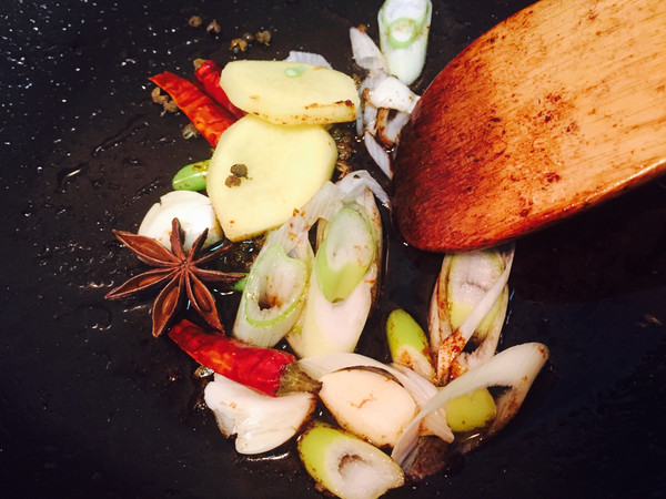 用锅中剩下的油炝锅,放入葱姜蒜,八角,花椒,干红辣椒。花椒是必不可少的陕北大烩菜精髓!