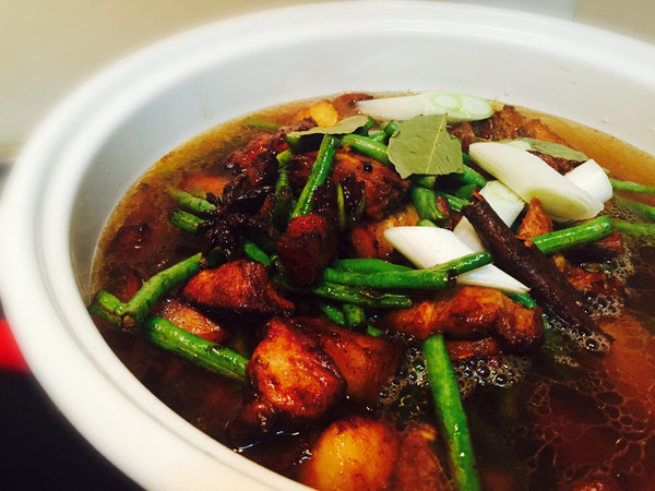 锅中倒入少量油,两片姜,一块八角,先倒入五花肉(排骨稍等),大火煸炒大概两分钟,肉的表面焦黄色,看到锅中冒泡泡的油了吗?!这时再倒入排骨一起炒。