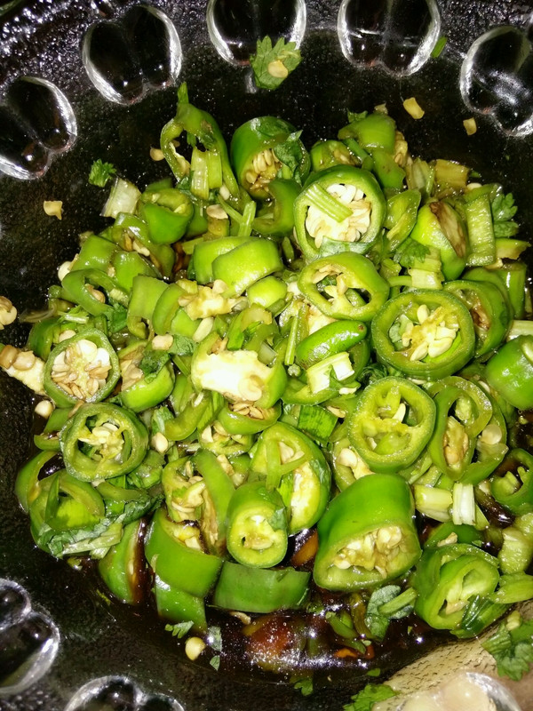准备原料,我是花坛里种的小线椒,虽然不好看,但是皮薄且嫩,比买的吃起来脆