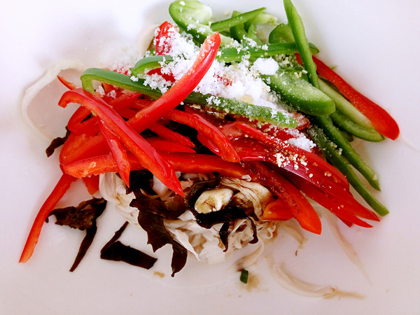 挤压掉一半水份,放入青红椒,木耳,蒜,加醋半勺,生抽半勺,糖半勺,香油半勺,搅拌均匀