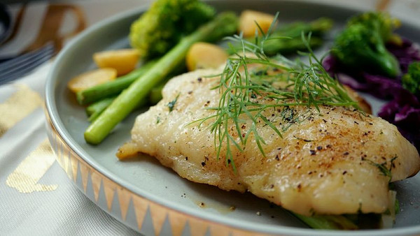 锅中热橄榄油,放入腌好的鱼块和芦笋煎。鱼肉比较散软易粘,油量可给足一些,不要多翻动。一面煎两分钟后翻面。