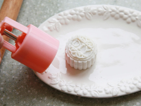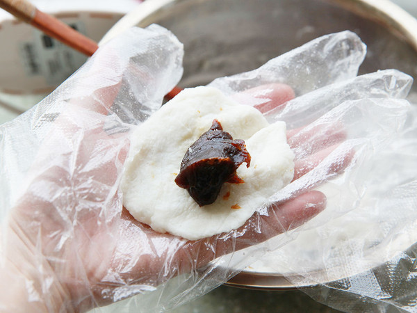 待面团冷却后,取30克左右,手掌压平,放入20克枣泥,包圆;(面团如果觉得太湿,可以揉一些熟的糯米粉进去增加面团厚度。)
