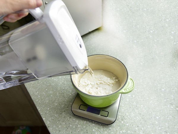 再将他们一起搅拌,熬煮浓稠至面糊可以整个抱团在铲子上,关火;