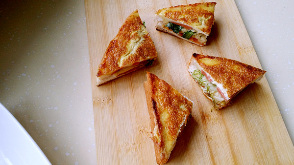之前抠出来的吐司瓤盖上,流出来的蛋液已经凝固成蛋饼惹,扯下来