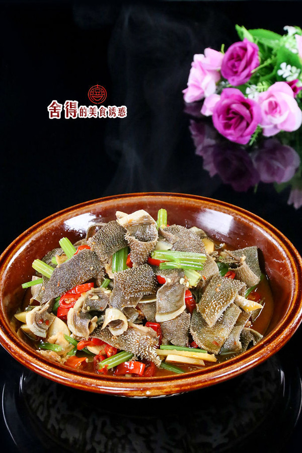 下入适量的郫县豆瓣酱和五花肉一起爆香,倒入泡蒜、泡姜、泡椒一起煸香,煸香后加入适量的高汤,胡椒粉和老抽焖煮2分钟,煮出泡蒜、泡姜、泡椒的味道后,开盖倒入毛肚拔均,盖上锅盖焖煮2分钟,之后下入芹菜和鸡精炒均,最后加入少量的生粉水勾薄芡,翻炒均匀即可起锅。