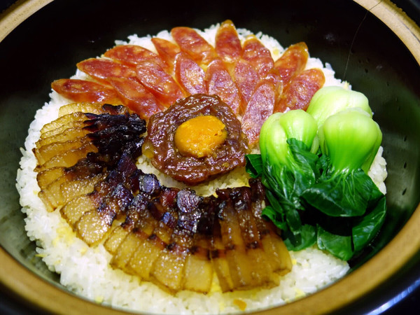 待砂锅里的米饭刚收汁,先在米饭上撒一些姜粒,迅速放入腊肉片、腊肠片和凤凰盏,留一个位置摆放青菜。加姜粒是我个人的口味,不喜欢的可以忽略。温馨提示:砂锅的热气有些大,小心不要烫到手了,或许可以借助烤牛排的夹子来放腊味。