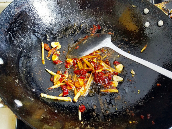 锅内再放少许油,下入姜蒜干尖椒炒香,下一勺豆瓣酱翻炒。