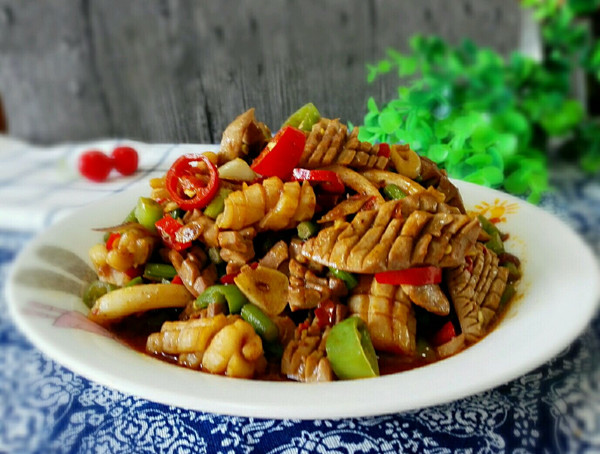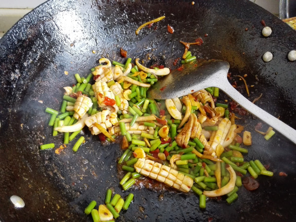 下入鱿鱼筒大火翻炒,如果太干,可加少许清水。
