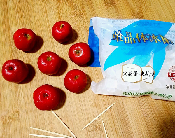 将填好红豆沙的山楂,盖上切下的那半,然后用牙签把它们串在一起。