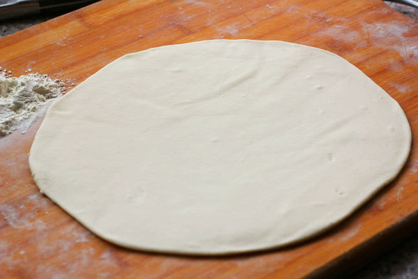 铺上四分之三的肉馅,用刀在肉馅的旁边把面皮划断。