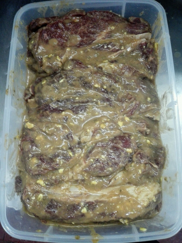 搅拌均匀后,再把牛排一份一份的放汁里均匀抹上汁放入另一个容器里。