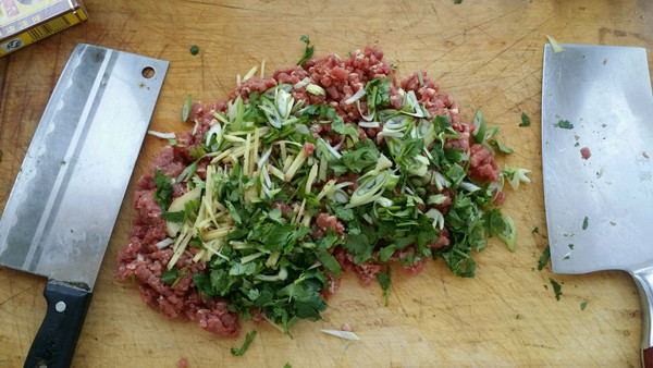 香菜,葱,姜,蒜,和牛肉一起剁,