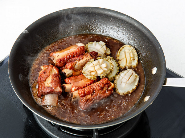 鲍鱼焯水(在水中放少许酒去腥)水开后关火取出,加入收汁的排骨中煮至鲍鱼上色,酱汁冒泡后关火即可。