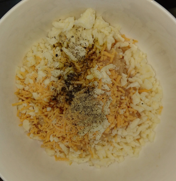 鸡肉末里加入黑胡椒碎,橄榄油,料酒,盐,鸡汁,生粉,芝士碎拌匀。我加了车打芝士和马苏里拉芝士