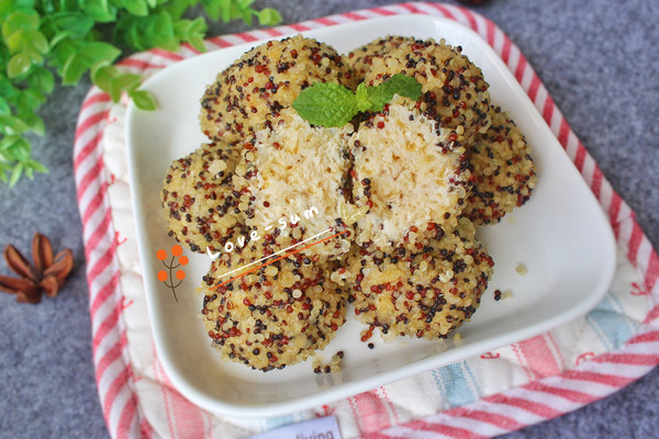 将鸡肉做成球状,在藜麦里滚一下,表面粘上藜麦,放在刷了少许橄榄油的碟里,蒸十分钟即可。